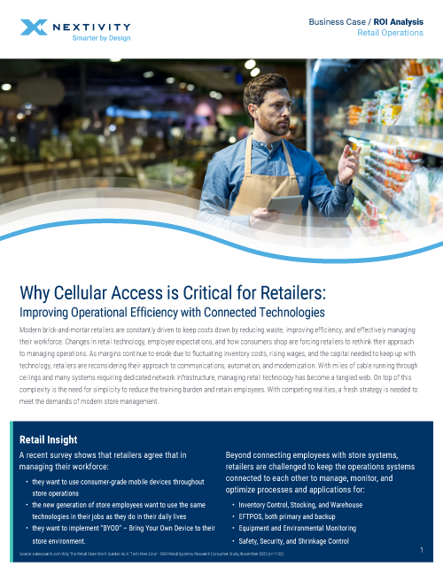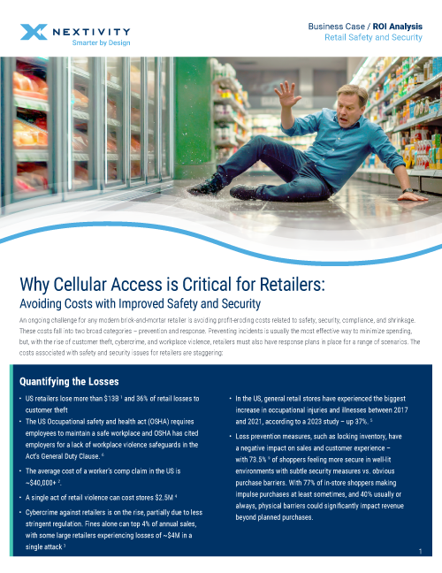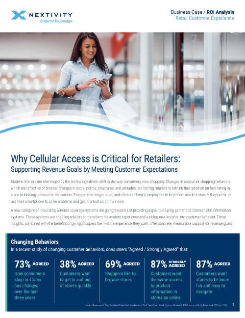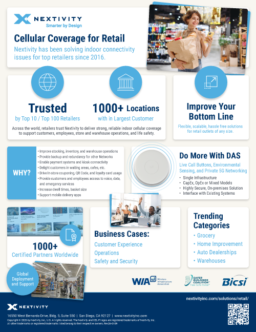 Unique to the industry, Nextivity Cellular and Public Safety Distributed Antenna Systems (DAS), create a wireless infrastructure retailers can leverage to gain a competitive advantage in the areas of customer experience, operations, safety and security.